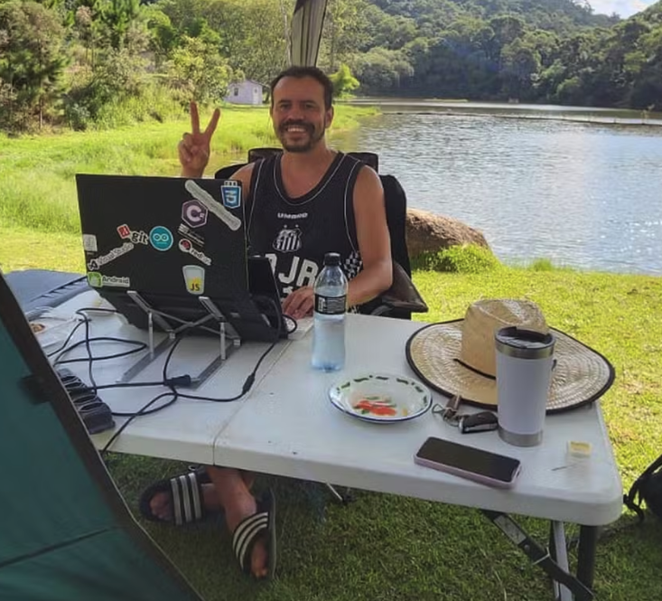 Laerte Nogueira trabalhando na parte da tarde diretamente de um camping no interior de São Paulo. — Foto: Arquivo Pessoal